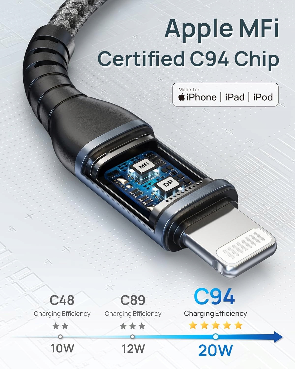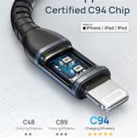 Ten Kabel USB C do Lightning ma ulepszone złącze C94 i oryginalny chip MFi, który zapewnia bezproblemową kompatybilność i brak komunikatów o błędzie wyskakującym; chroni urządzenia przed przeciążeniem i przepięciem podczas ładowania.