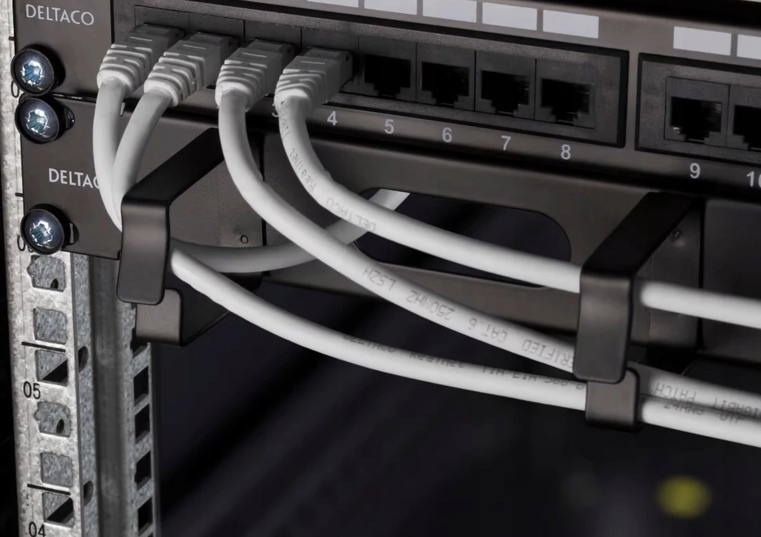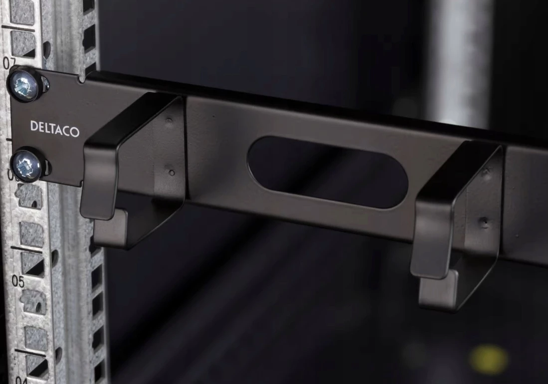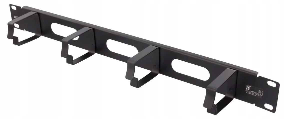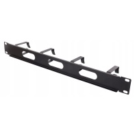 DELTACO 19″ 1U Metalowy system zarządzania kablami ze szczotką, 4 metalowymi pierścieniami.