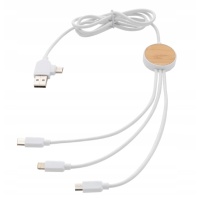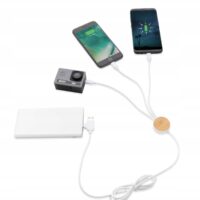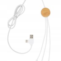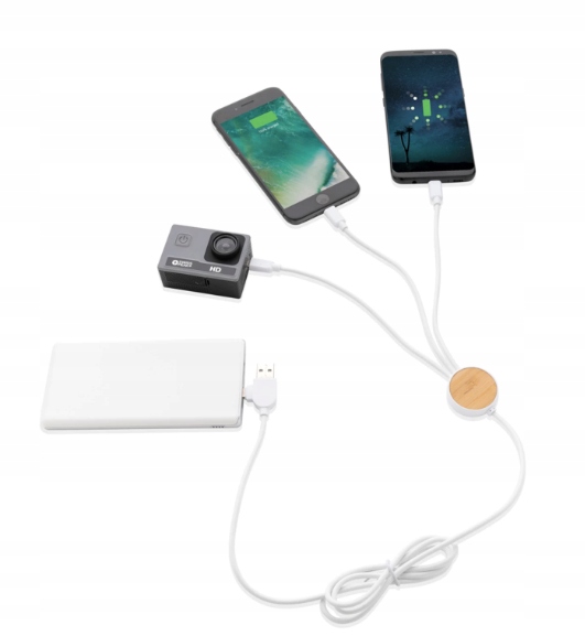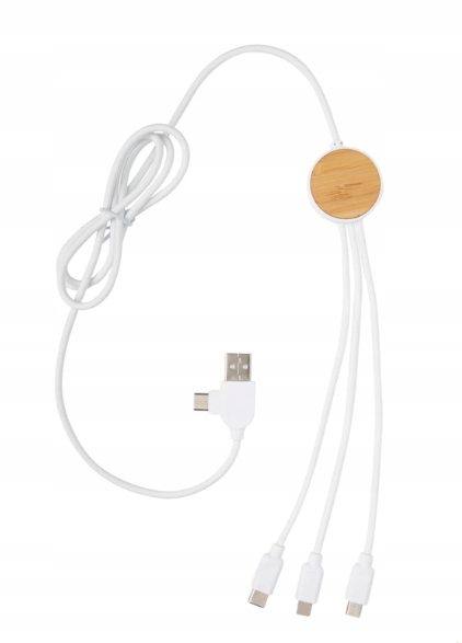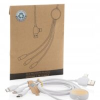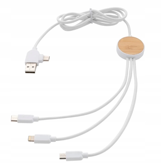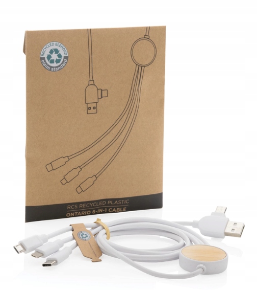 Kabel wielofunkcyjny o długości 120 cm wykonany z certyfikowanych materiałów pochodzących z recyklingu. W zestawie 5 różnych złączy: wejście USB C, wejście USB A, wyjście typu C, wyjście IOS i wyjście micro USB. Pozwala to również na użycie kabla z urządzeniami wyjściowymi typu C, które wchodzą w skład nowszych generacji telefonów i komputerów Macbook. Kabel ma również opcję wejścia wyjściowego USB A, dzięki czemu może ładować dowolne urządzenie z dowolnego źródła wyjściowego.
