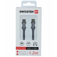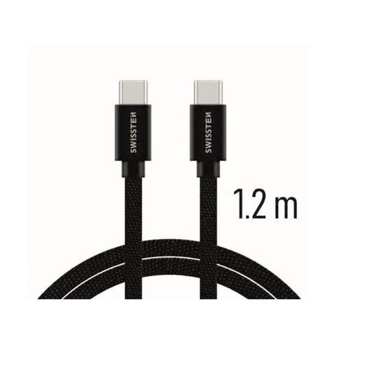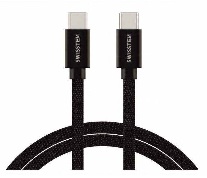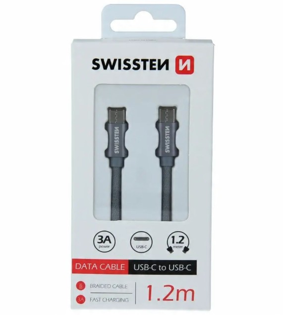 Kabel Swissten USB-C/USB-C z wysokiej jakości oplotem. Dzięki swojej długości 1,2 m nadaje się do samochodu, biurka czy stolika nocnego. Kabel jest wzmocniony, dzięki czemu przenosi większe natężenie (do 3A) i może obsługiwać szybki transfer danych 480 Mb/s. Żywotność kabla przy zginaniu wynosi ponad 10 000 zgięć. Metalowa osłona złączy jest bardziej odporna na uszkodzenia mechaniczne niż tradycyjne plastikowe osłony złączy.